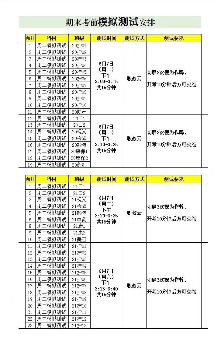 考虑到期末考试是大型的全校统考,为维护公平性和严肃性,教务科经过多次研判,提前一个月制定了期末考试方案:“考查课”由任课老师用问卷星或职教云等完成测试;“考试课”则由教务科统一组织学生在“职教云”平台进行线上统考,虽然职教云平台上考试筹备工作较复杂,但优点是它的随机组卷方式更科学、更有利于考出学生真实水平。