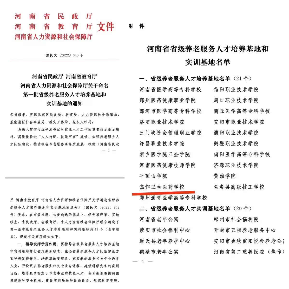 2022年底,河南省民政厅、河南省教育厅、河南省人力资源和社会厅联合印发《关于命名第一批省级养老服务人才培养基地和实训基地的通知》(豫民文【2022】345号),我校成为首批21家省级养老服务人才培养基地之一。
