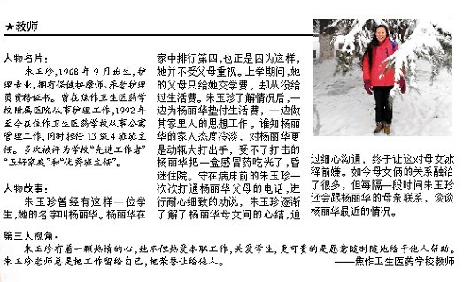事件回放:去年我校“锅炉事件”突发后,学校采取了一系列救急措施,各处室人员、班主任、德育辅导员自发行动起来,想方设法保证了千余名在校生喝上热水,并在短时间内维修好了锅炉。省医药卫生报记者张蕾在我校网站看到相关信息后,很受震撼,专程到学校进行采访。在向班主任们了解情况时,张记者初识朱玉珍老师。后来,张记者再次来到学校专访朱老师,被她爱校爱生,朴实热情、无私助人的精神深深感染,表示朱老师的精神值得每一个人学习。
