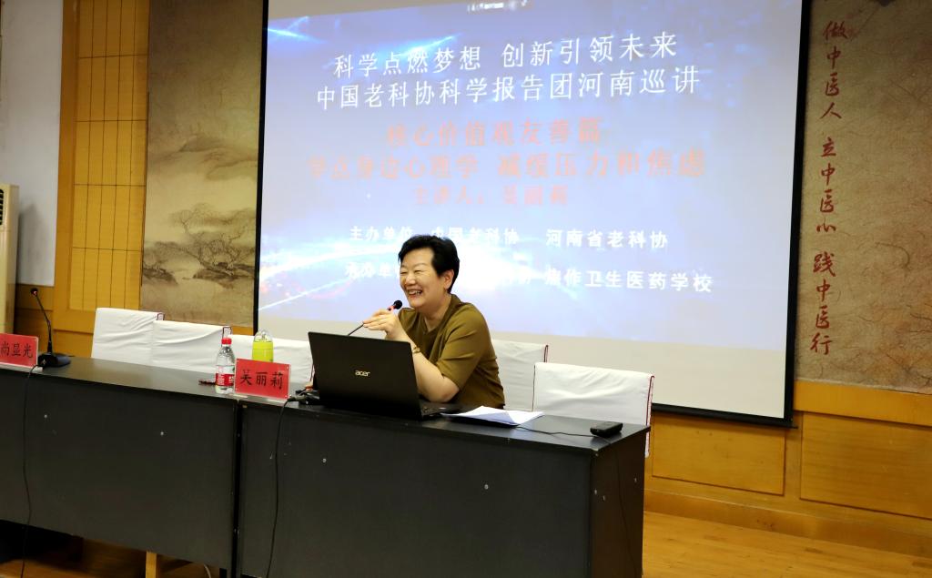 6月6日,为深入学习贯彻党的二十大精神,进一步贯彻落实《全民科学素质行动规划纲要(2021-2035年)》相关要求,普及科学知识,倡导科学方法,传播科学思想,弘扬科学精神,我校举办中国老科协科学报告团河南巡讲活动,本次活动由中国老科协、河南省老科协主办,焦作市老科协和学校共同承办,邀请中国老科协科学报告团成员、河南省首席科普专家、河南省老科协副会长吴丽莉作题为《核心价值观友善篇---学点身边心理学 减缓压力和焦虑》的专题报告,全体教师、班主任、中层干部近120人参会并聆听讲座。报告会由医党委书记尚显光主持。