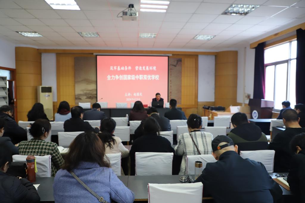 赵国庆以《筑牢基础条件营造发展环境 全力争创国家级中职双优学校》为题,就我市拟遴选优质学校、优质专业的条件详细解读。提出对标一流、提质创优,实施“五大工程”,确保双优学校项目落地见效。要求学校紧紧围绕创“双优”这一既定目标,举全校之力推进实施“五大工程”建设,一步一个脚印把“规划图”变为“施工图”,把“时间表”变为“进度表”。进一步夯实基础,以“时不我待、只争朝夕”的紧迫感和“时时放心不下”的责任感,完成国家级中职“双优学校”的争创工作。