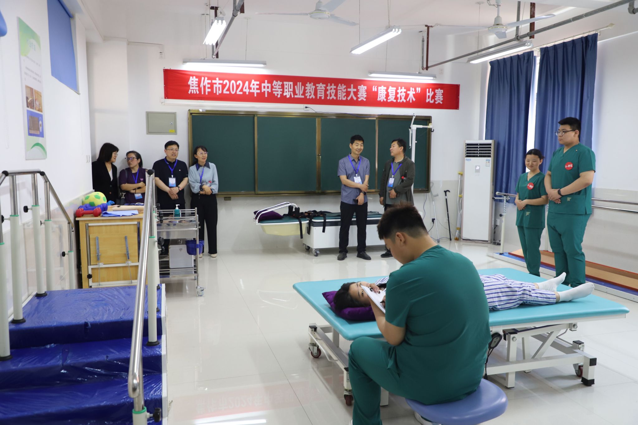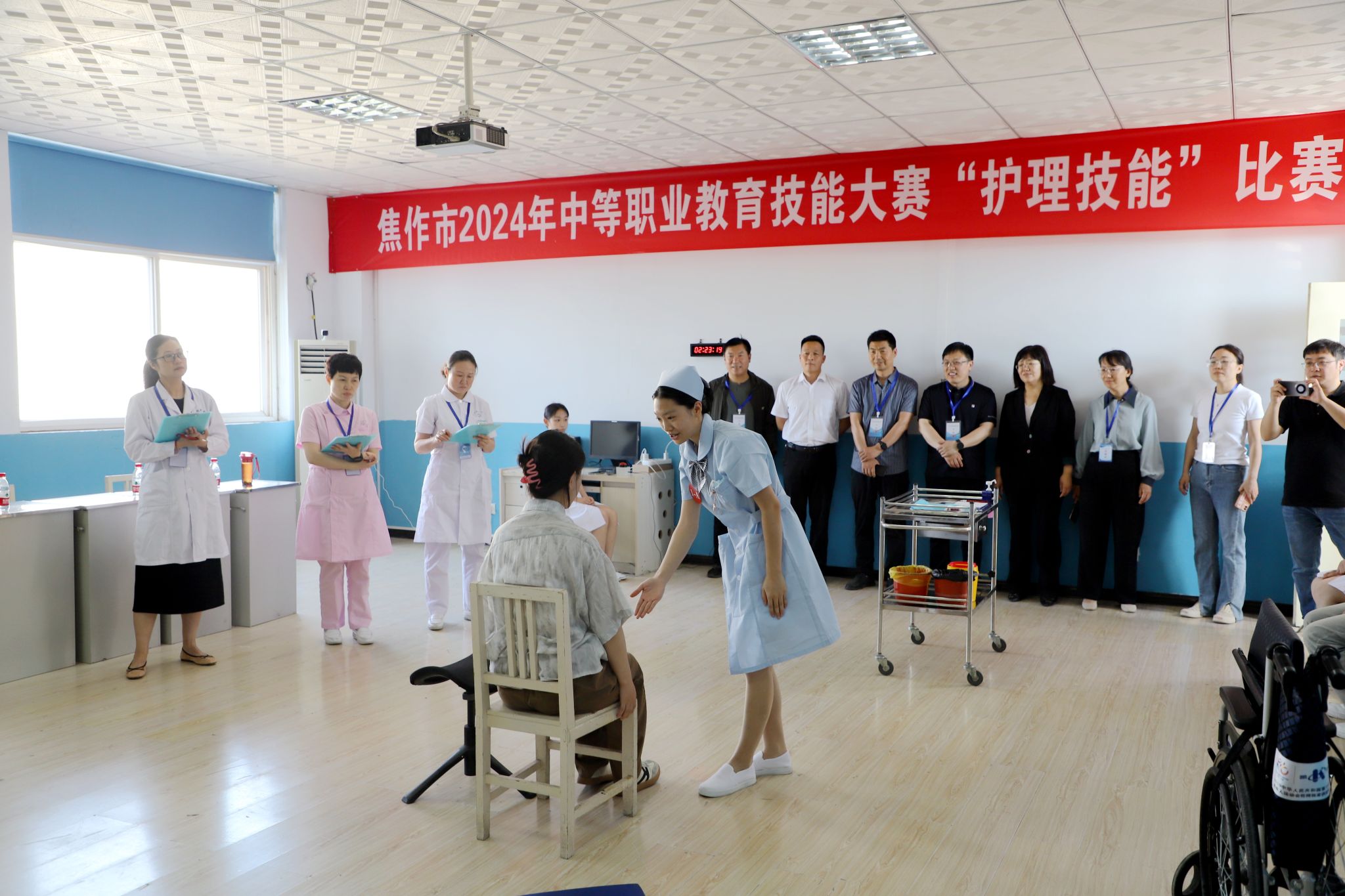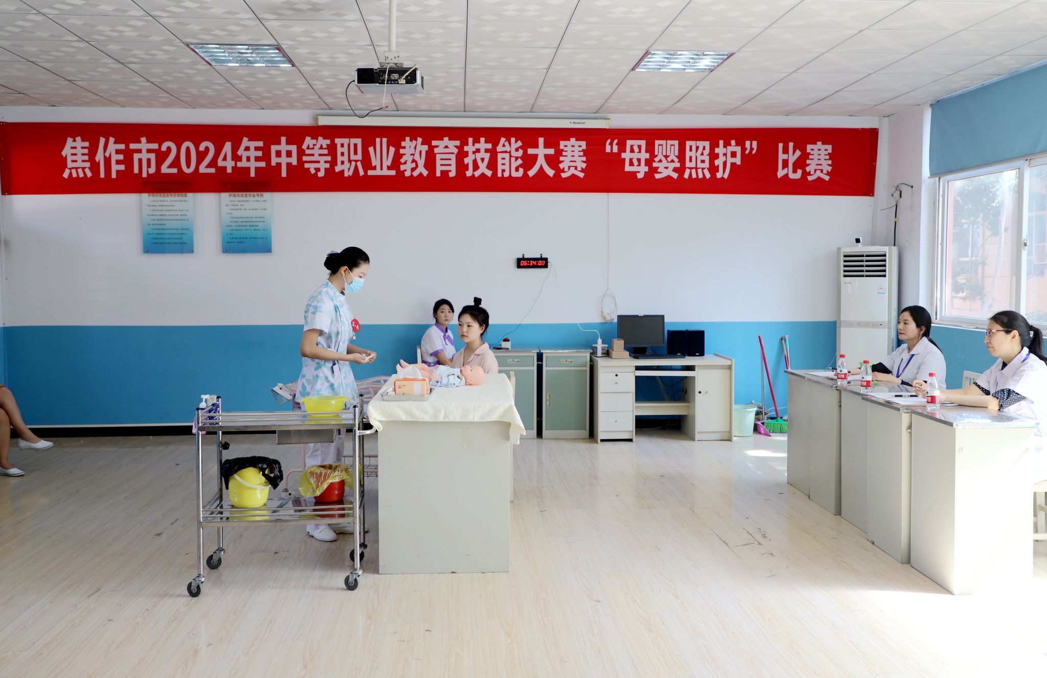 本次大赛,共有来自焦作卫生医药学校、焦作市护理学校、焦作市职教中心三所学校的32名学生积极参赛。比赛以临床工作任务为导向,主要考察选手解决临床实际问题能力和团队协作能力。为确保各项赛事顺利进行,市教育局职业与成人教育研究室主任雷军、副主任张大凯和汤婧、陈小军老师到现场观摩指导,焦作市教育电视台全程直播。