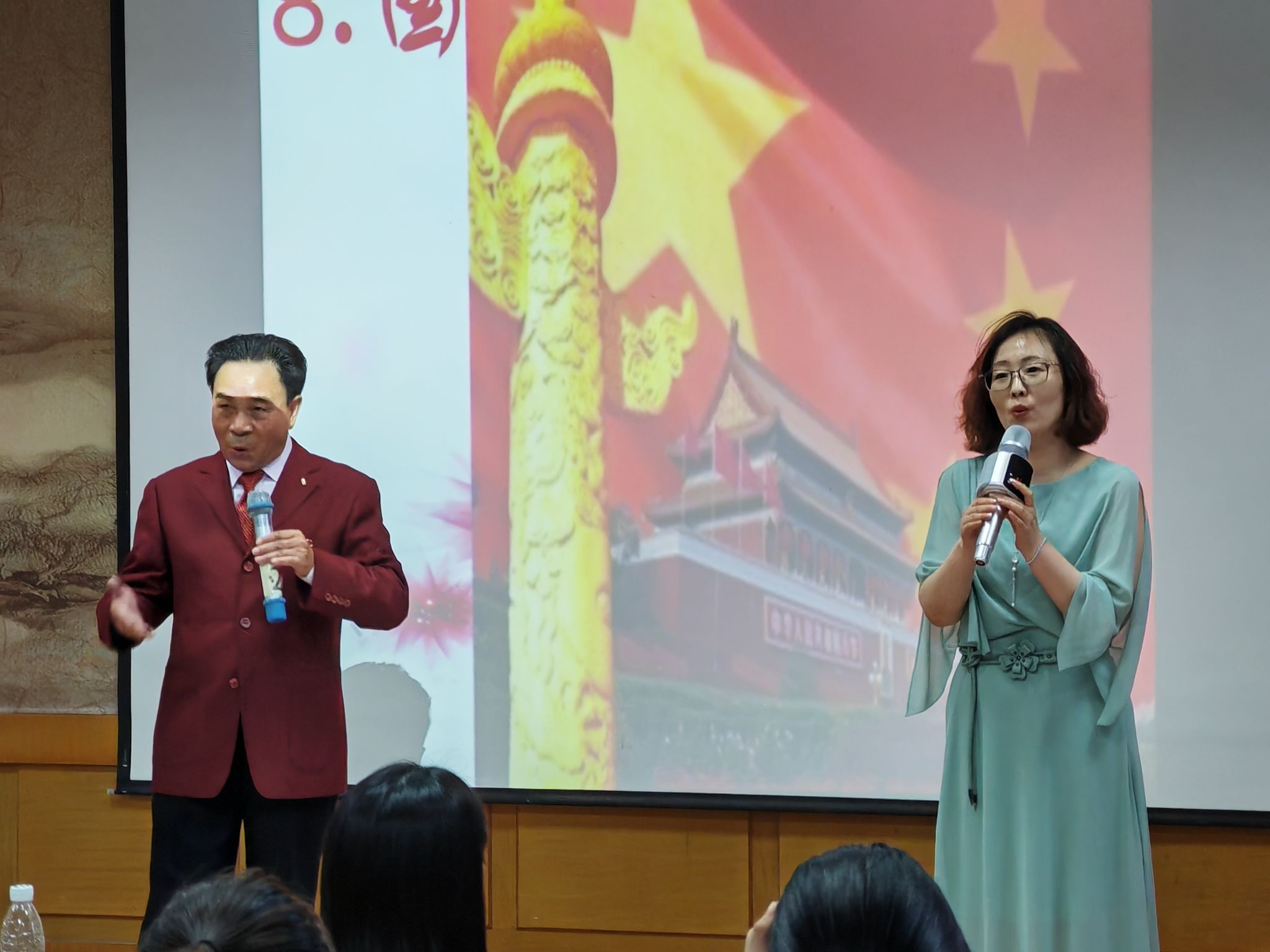 此次思政课分为娘、爹、党、国、史等13个篇章,通过演歌方式,引导学生树立孝敬父母、爱党爱国等家国情怀。在授课过程中,陈老师通过介绍音乐作品的创作背景和意义,然后通过演唱的形式,将音乐融入思政课中,既加深了师生对思政课内容的理解,也强化了学生社会主义核心价值观的树立。一首由陈国春老师和孟天屹老师合唱的《我爱你中国》将整场思政课推向了高潮,浓烈的爱国情感搏得了全场师生的阵阵掌声。