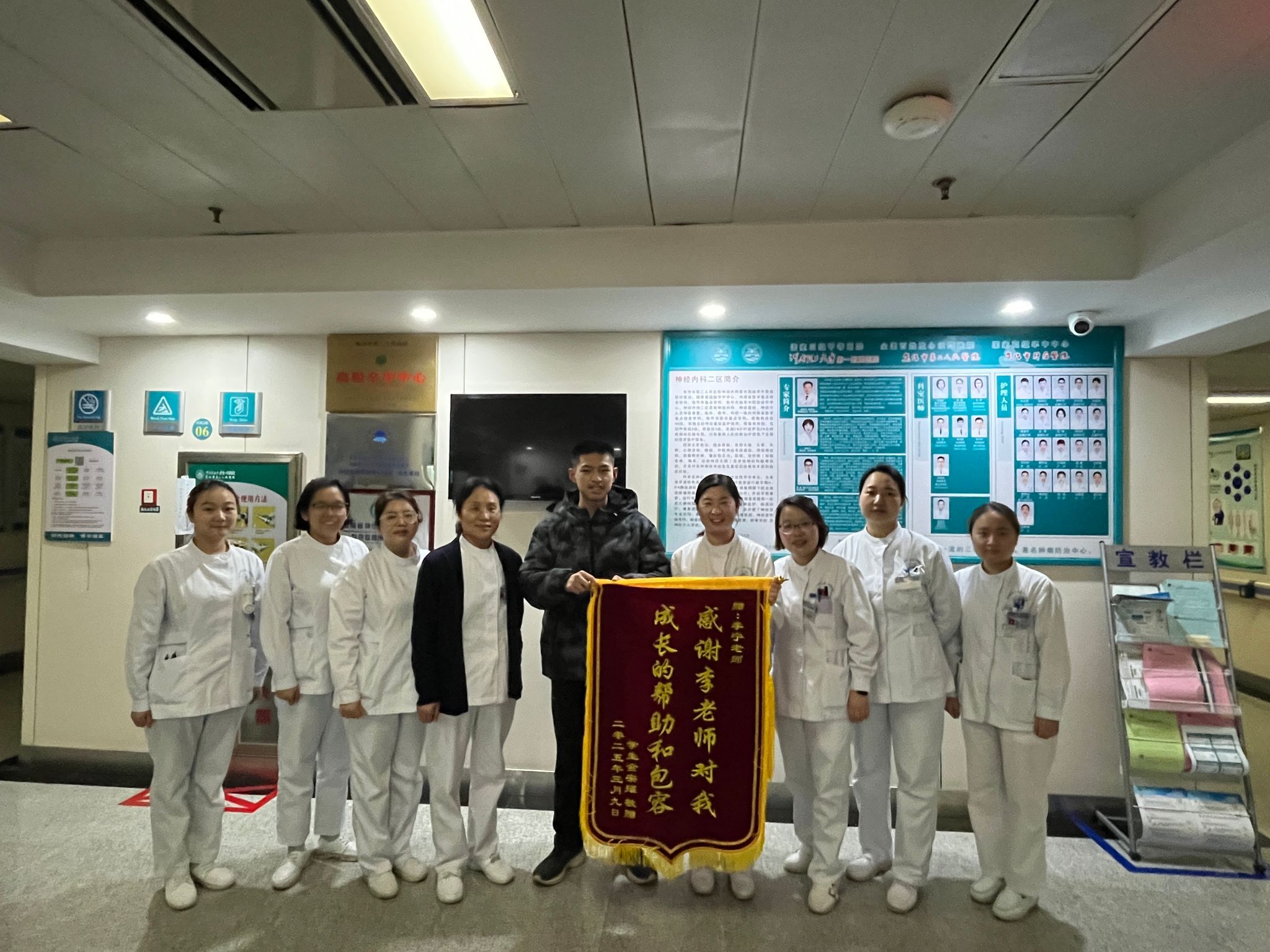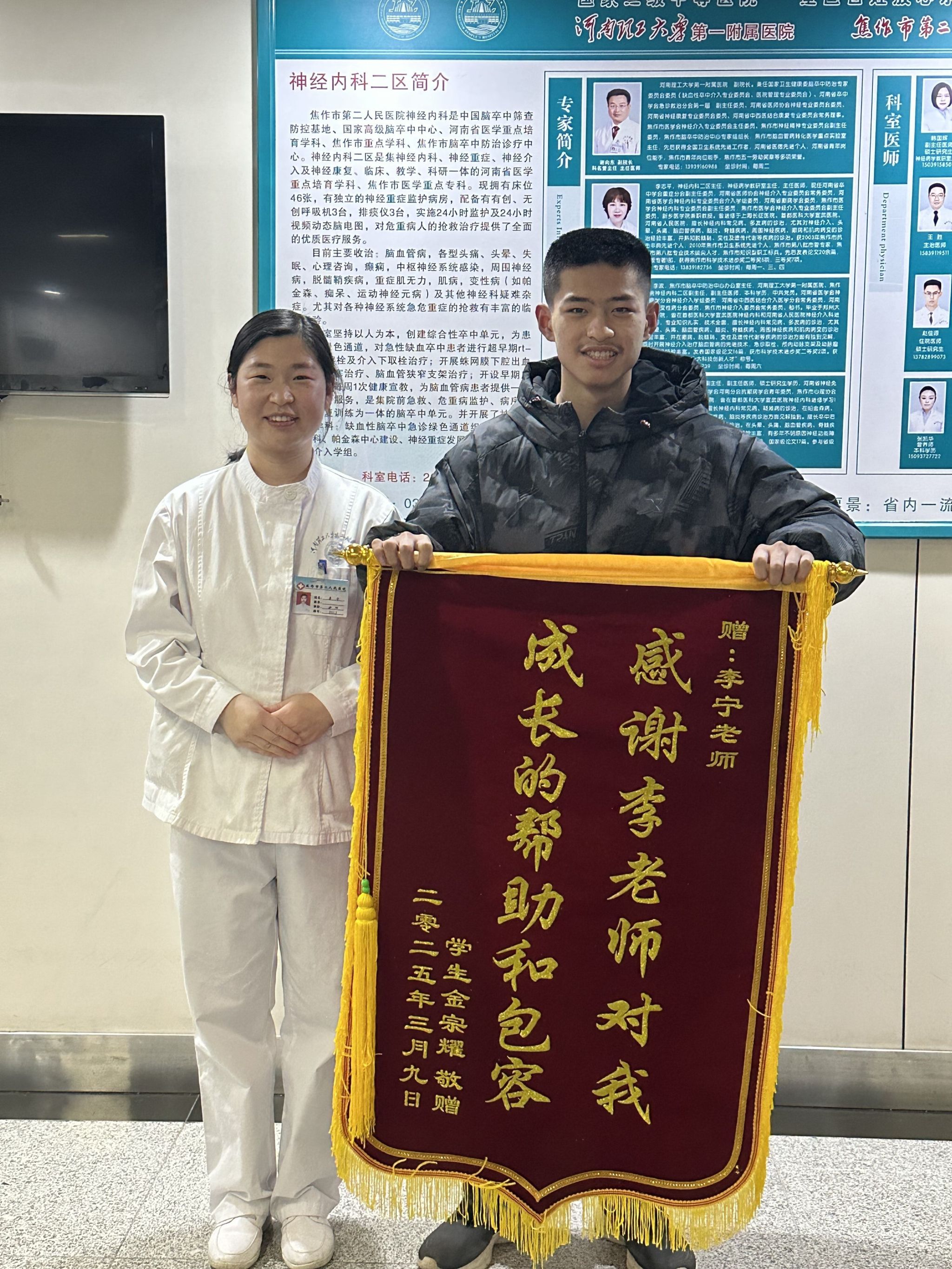 在李老师的悉心教导下,金宗耀进步飞速。他从最初的手足无措,到能够得心应手地完成各项护理任务,还学会主动与患者沟通,给予他们温暖与安慰。金宗耀说:“李老师不仅教会我专业知识,更让我懂得了作为一名护理人员的责任与担当。她的每一句指导、每一次示范,都像一盏明灯,照亮我前行的道路。” 心怀感恩的金宗耀,在转科之际,特意定制了锦旗,上面写满对老师的感激。