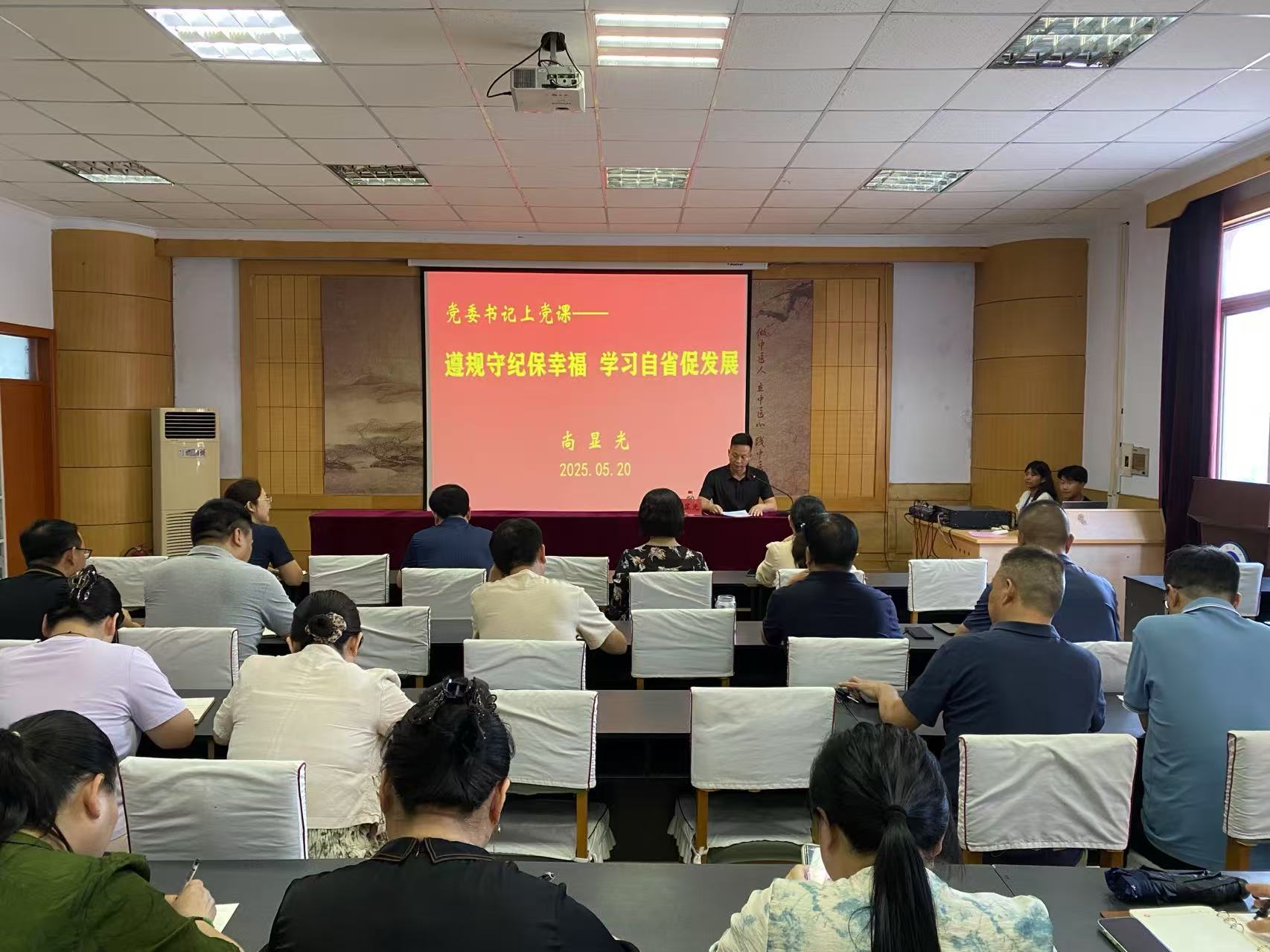 为扎实推进深入贯彻中央八项规定精神学习教育,进一步强化党员干部遵规守纪意识,提升自我革新能力。5月20日下午,党委书记尚显光以《遵规守纪保幸福 学习自省促发展》为题讲了一次专题党课。全体党员、全体班主任和相关科室工作人员参加了党课培训。