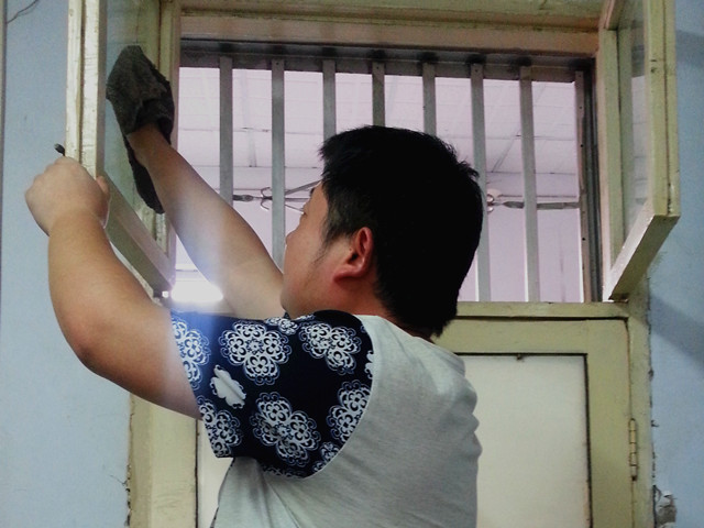 学生科组织”洁净校园,文明你我”为主题的卫生大扫除活动。各班主任亲自把关,同学们积极参与,人人动手:擦玻璃,拭墙面、扫地、拖地、整理桌凳、清理卫生死角,校园内随处可见忙碌的身影,同学们人人都为创建省级文明城市贡献自己的一份力量。通过大家的共同努力,教室窗明几净,地面整洁,桌椅摆放有序、地面一尘不染;学生公寓干净整洁,物品摆放整齐,整个校园环境焕然一新。(供稿:焦福利)