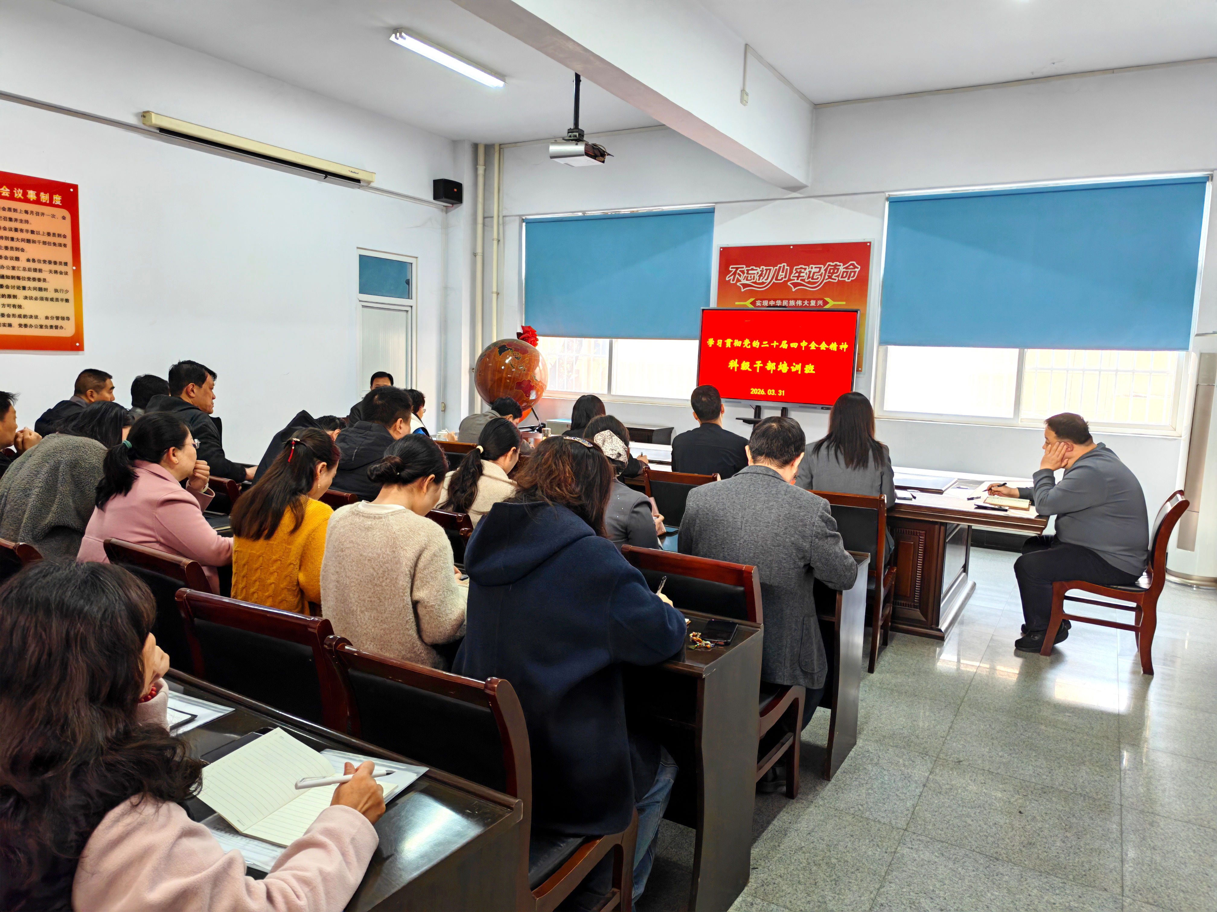 为深入学习贯彻党的二十届四中全会精神,引导广大党员干部把思想和行动统一到全会精神上来,按照上级党委通知精神,我校党委决定在科级干部和全体党员中组织开展学习贯彻党的二十届四中全会精神培训。3月31日上午,校领导班子、全体科级干部在护理楼会议室集中收看“‘十五五’时期经济社会发展的指导思想、重大原则和根本保证”专题辅导讲座。