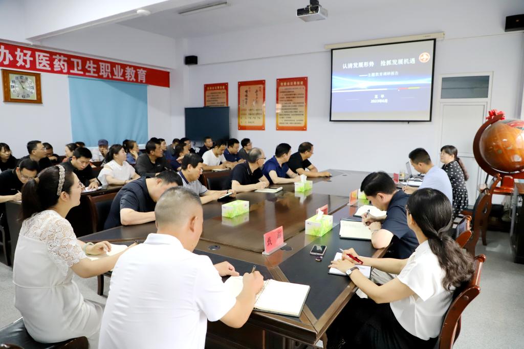 王平以《认清发展形式 抢抓发展机遇》为题,分享了主题教育调研成果。调研报告围绕主题教育的目标要求和重点措施,结合近年来国家及河南省出台的等一系列纲领文件和翔实数据,全面分析了职业教育发展趋势、卫生健康行业人才需求和医药卫生类中等职业教育发展定位,深刻阐述了医药卫生类中等职业教育发展趋势。报告立足学校面临的“办学层次的提升”这一机遇,以及“职业教育生均拨款制度的实施”这一挑战,明确提出下一步工作打算:一是深化教育教学改革,努力提升办学质量;二是抢抓发展机遇,努力提升办学层次;三是转换思想观念,大力优化管理模式。