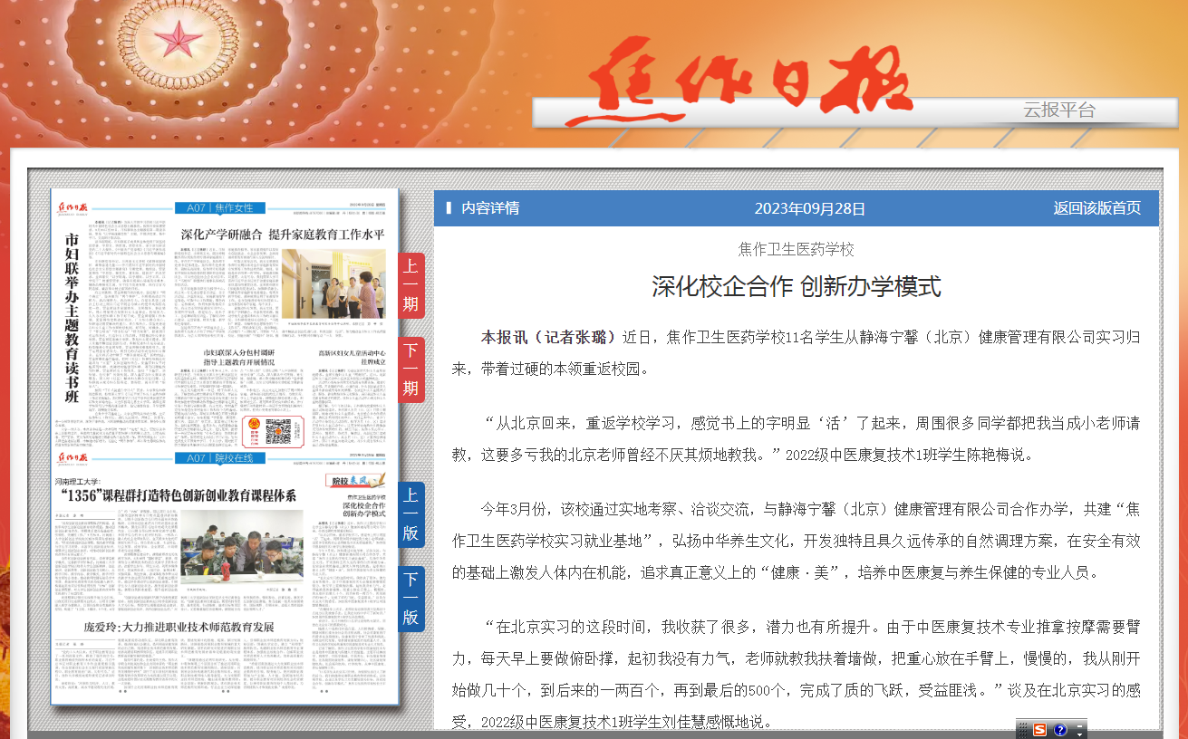 2023年9月28日《焦作日报》以《深化校企合作 创新办学模式》为题,对医学中专部进行了专访报道。详情如下: