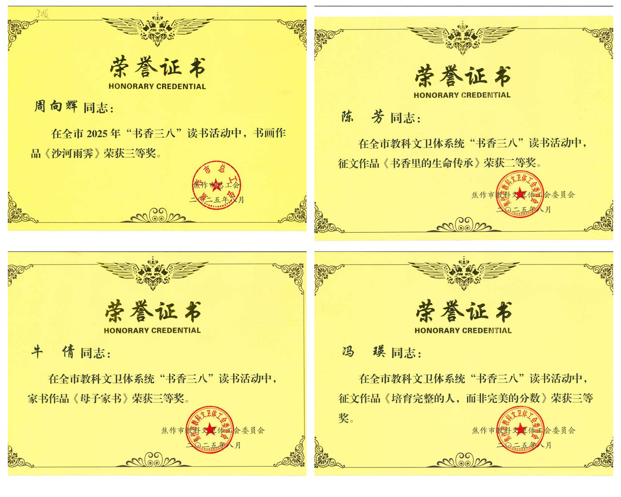 近日,由焦作市总工会和焦作市教科文卫体工会主办的“书香三八”读书活动评选结果正式揭晓。经过层层筛选与专家评审,我校推荐的7位女职工创作的作品从众多参赛作品中脱颖而出,喜获佳绩,充分展现了我校女性热爱阅读、勤于思考、善于表达的精神风貌与卓越才华。