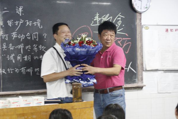 此时,在第17教室,德育老师孙宏庆身着整洁的工作服,如往常一样,正站在讲台上板书,认真地在上他的“最后一节课”,该班学生和班主任成有军老师在台下静心聆听。伴随着热烈的掌声,韩冬风代表学校领导班子为孙老师送上一束芬芳的鲜花,感谢孙老师多年来为教学工作和学校发展的无私奉献,并对孙老师的退休生活给予美好祝福。孙老师热泪盈眶,激动地和大家一一握手道别,感谢学校的深厚关怀。全体人员与孙老师合影留念,记录下这最珍贵的一瞬间。