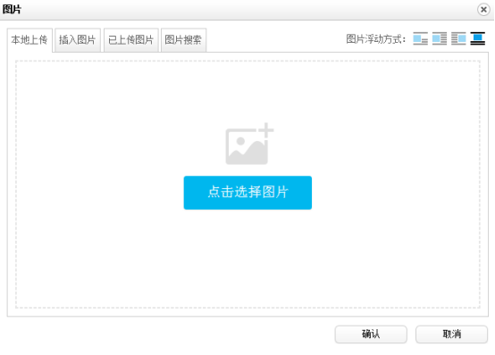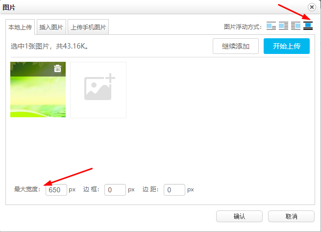 第二种方法:在文章维护界面中,将鼠标放到正文中需要插入图片的位置,然后点击编辑器工具栏中的“插入图片”按钮,出现如下图(一)所示网页对话框,选择添加好图片之后,在图(二)状态下根据需要调整图片的“最大宽度“和”浮动方式“。添加完所有图片后选择”开始上传“按钮,最后确定即可。