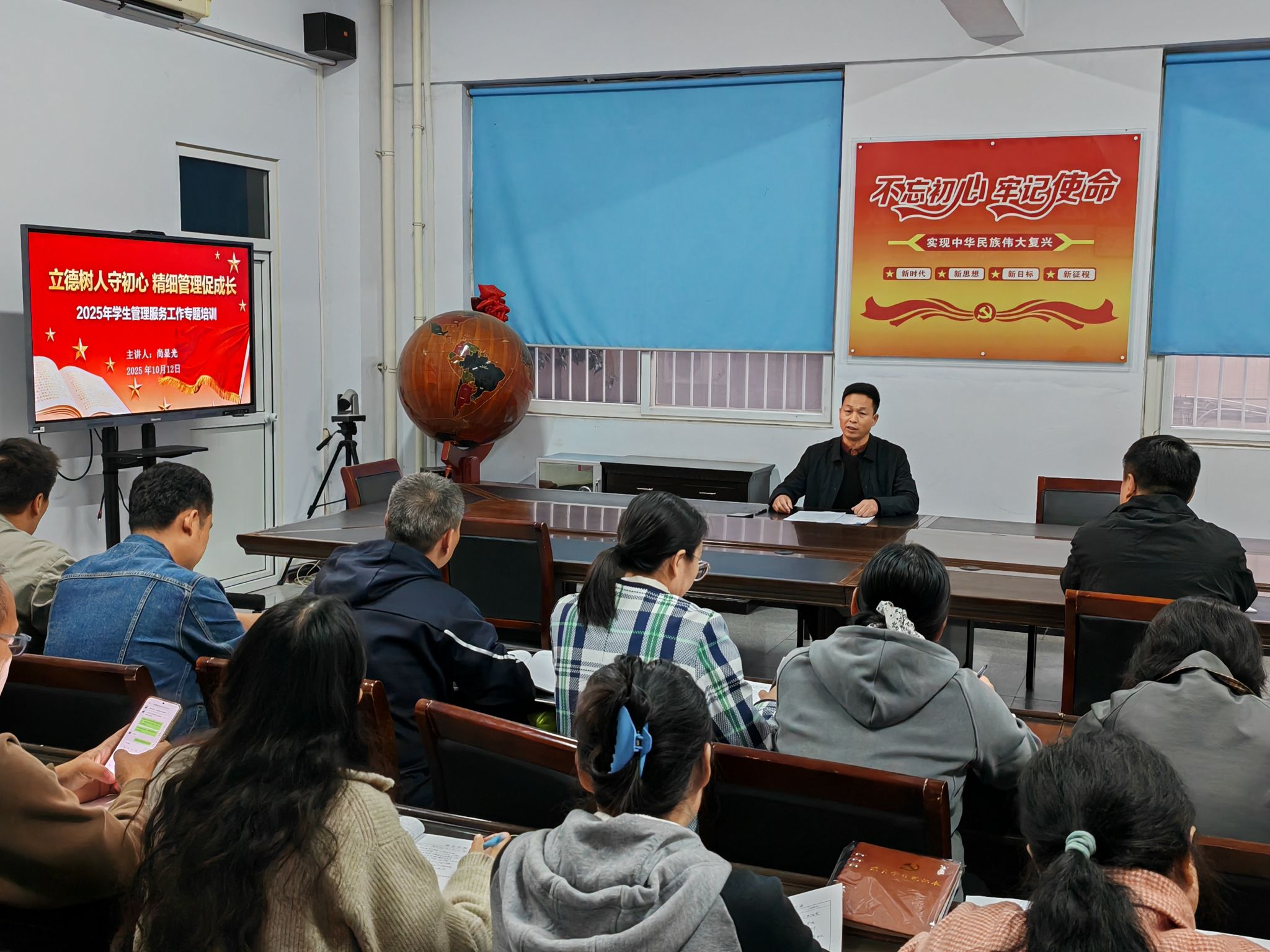 为全面提升班主任队伍的管理育人水平,切实保障学生健康成长,10月12日下午,党委书记尚显光以“立德树人守初心 精细管理促成长”为题,为2024级、2025级学生班主任讲授专题党课。会议由学生科科长毋涛涛主持。