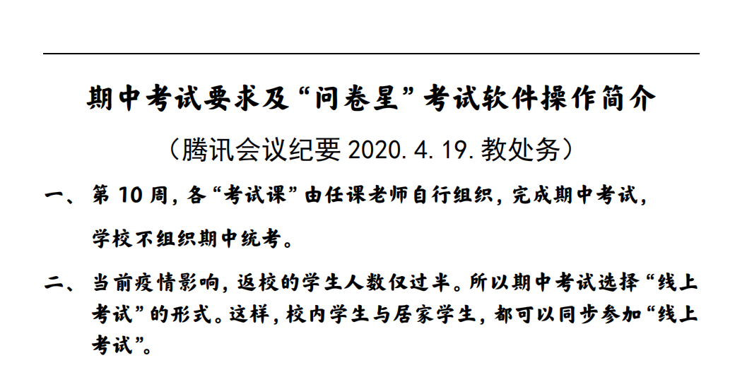 为了让老师们尽快掌握使用线上考试软件,教务科于4月19日下午以腾讯会议的形式,组织全校教师参加了问卷星软件操作培训,并制作发布了培训会议纪要和软件操作讲解视频,供老师们学习使用,为本学期的线上教学与线上考试奠定了良好基础,使得线上期中考试顺利完成。