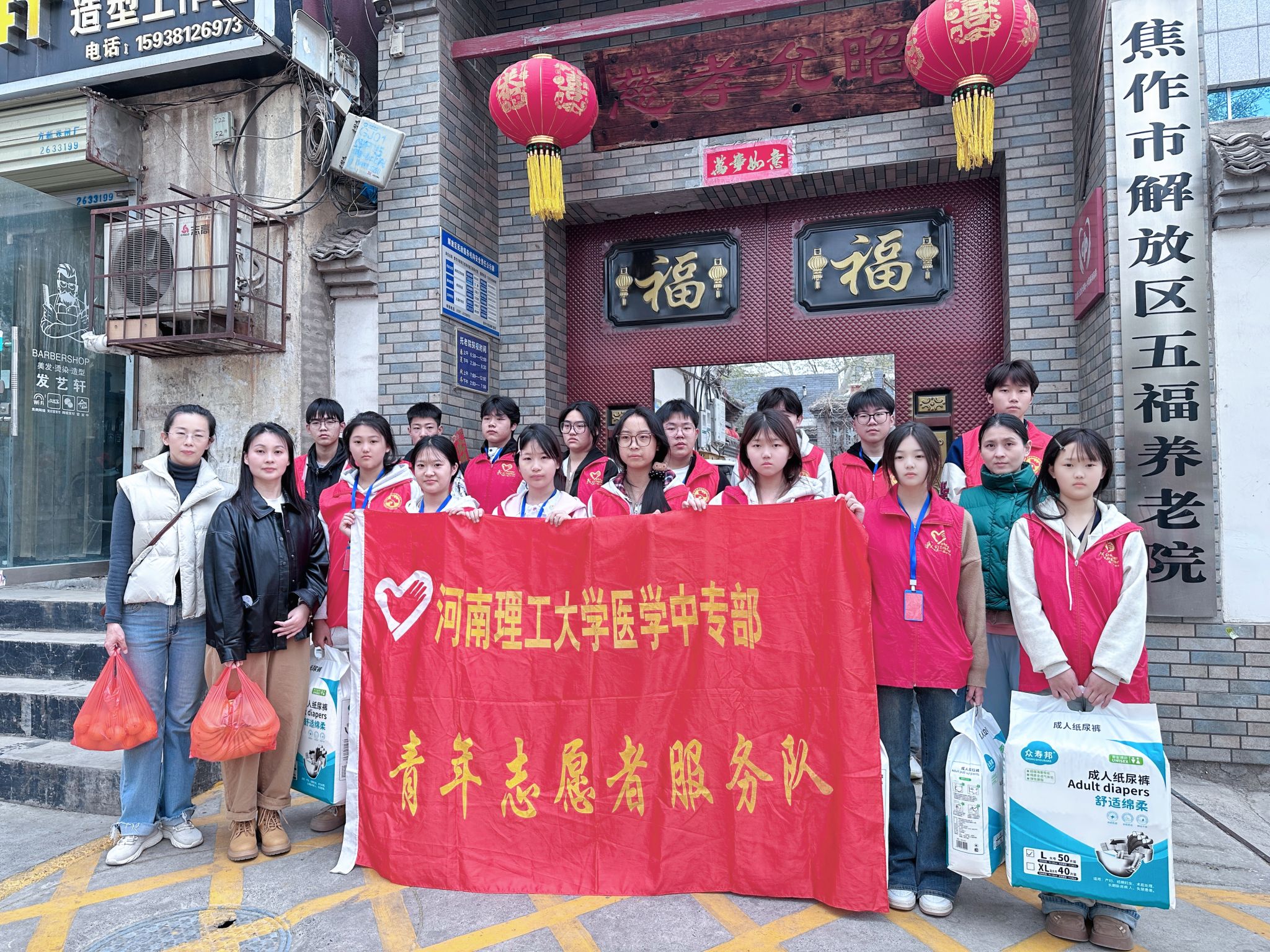 2025年3月27日星期四,在春意盎然的季节里,我校的一支充满活力与爱心的志愿者服务队来到了位于焦作市解放区的“五福养老院”,为这里的老人带来了满满的关怀与温暖。在团委老师的精心带领下,15名热情洋溢的学生志愿者积极参与了此次意义非凡的活动。