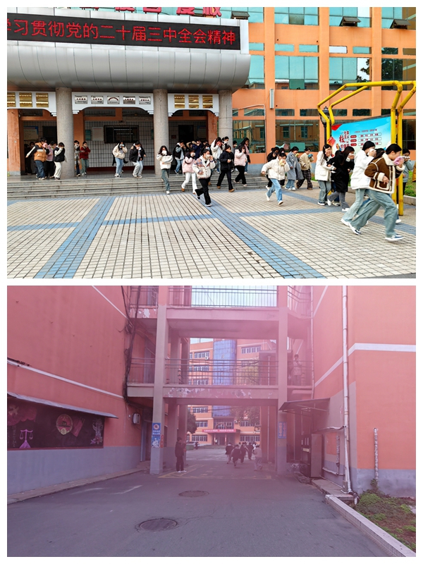 随着一阵急铃笛响起,楼道内冒起浓烟,班主任们快速指导学生进行安全疏散。同学们深弯腰、捂口鼻、沿着墙壁快速有序撤离,安全到达操场指定位置。
