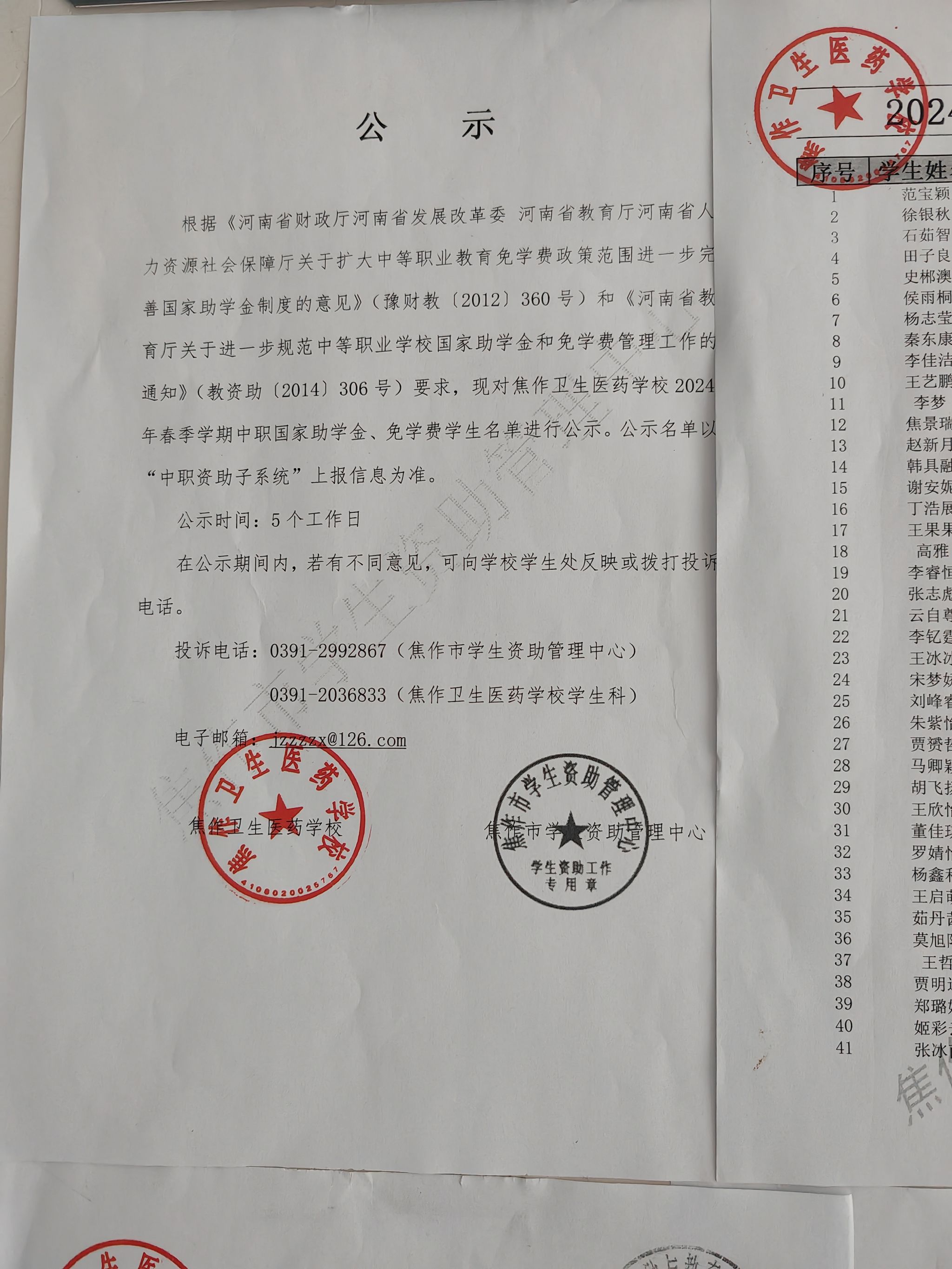 免学费助学金材料公示