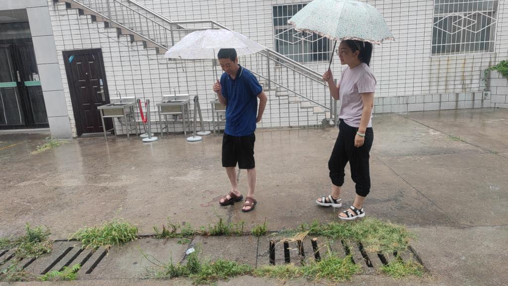 王海娟巡查了学校周边围墙、教学楼、宿舍楼、办公楼等,并着重查看了学校的排水设施,排查安全隐患。检查完毕后,王海娟与参与检查的人员对检查情况进行了汇总分析,明确要牢固树立安全意识,如有安全隐患则立即整改,或采取防范措施,防止暴雨天气导致各类突发事件发生。