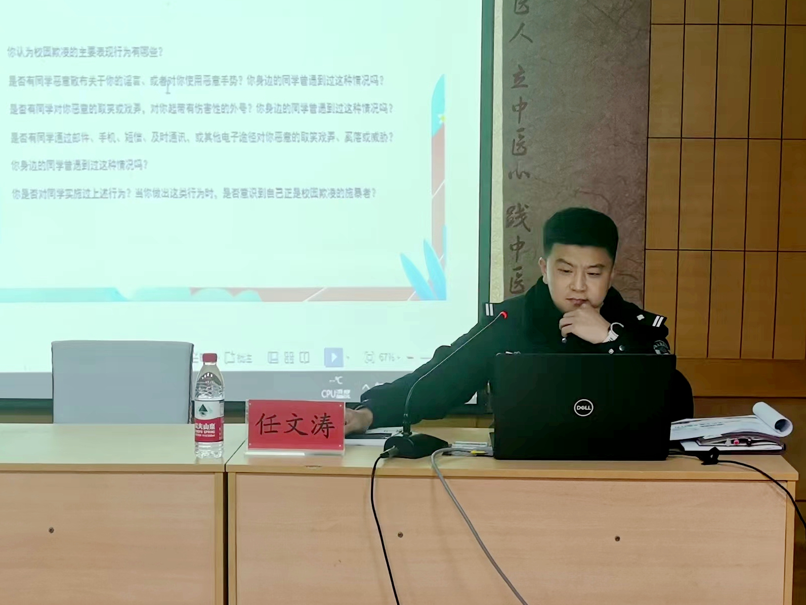 任文涛从一段视频《校园的你》引出校园欺凌这个话题,再围绕什么是校园欺凌、校园欺凌的特征,欺凌行为有哪些、校园欺凌发生的原因、校园欺凌的危害及做法这几个方面进行讲述。通过列举一系列校园欺凌的真实事件让学生深刻认识到校园欺凌的严重性,并从法律的角度告诉学生遇到校园欺凌的正确做法。他希望同学们从自身做起,加强思想道德修养,加强自我保护意识,积极行动起来,既不要做校园欺凌的“旁观者”,也不要做“受害者”,更不能做“欺凌者”。又向学生们讲解汇款诈骗、网恋诈骗、“套路贷”等诈骗手段,同时传授应对和预防方法。