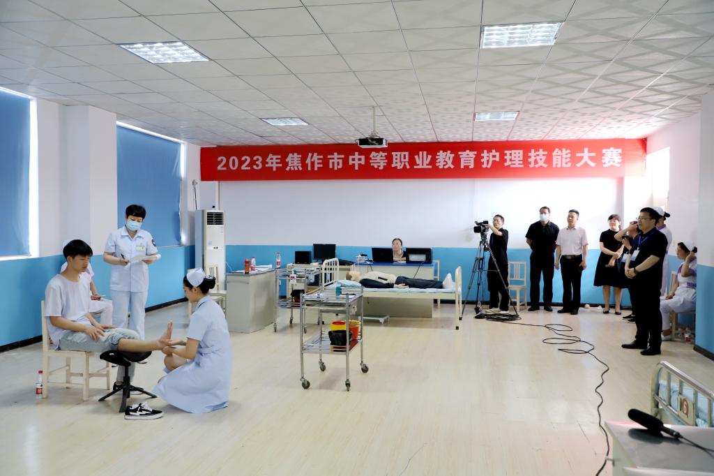 为深入学习贯彻党的二十大精神,落实立德树人根本任务,做好我市“双元培育”工作,加强中等职业学校技能教学,提高学生训练水平和综合素质,5月17日上午,焦作市中等职业教育护理技能大赛在中专部如期举行。焦作市教育局职成教研室主任雷军莅临赛场观摩指导,医学中专部主任王平、党委书记尚显光现场陪同。